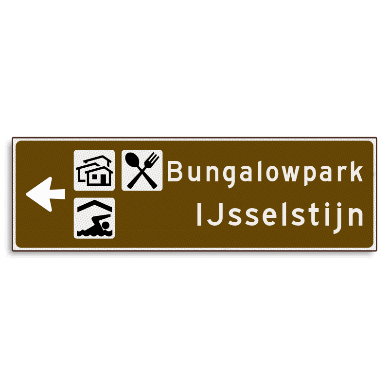 Verwijsbord KOKER Bruin/wit/zwart - pijl links, 2 regelig met 3 pictogrammen - Klasse 3 reflecterend