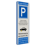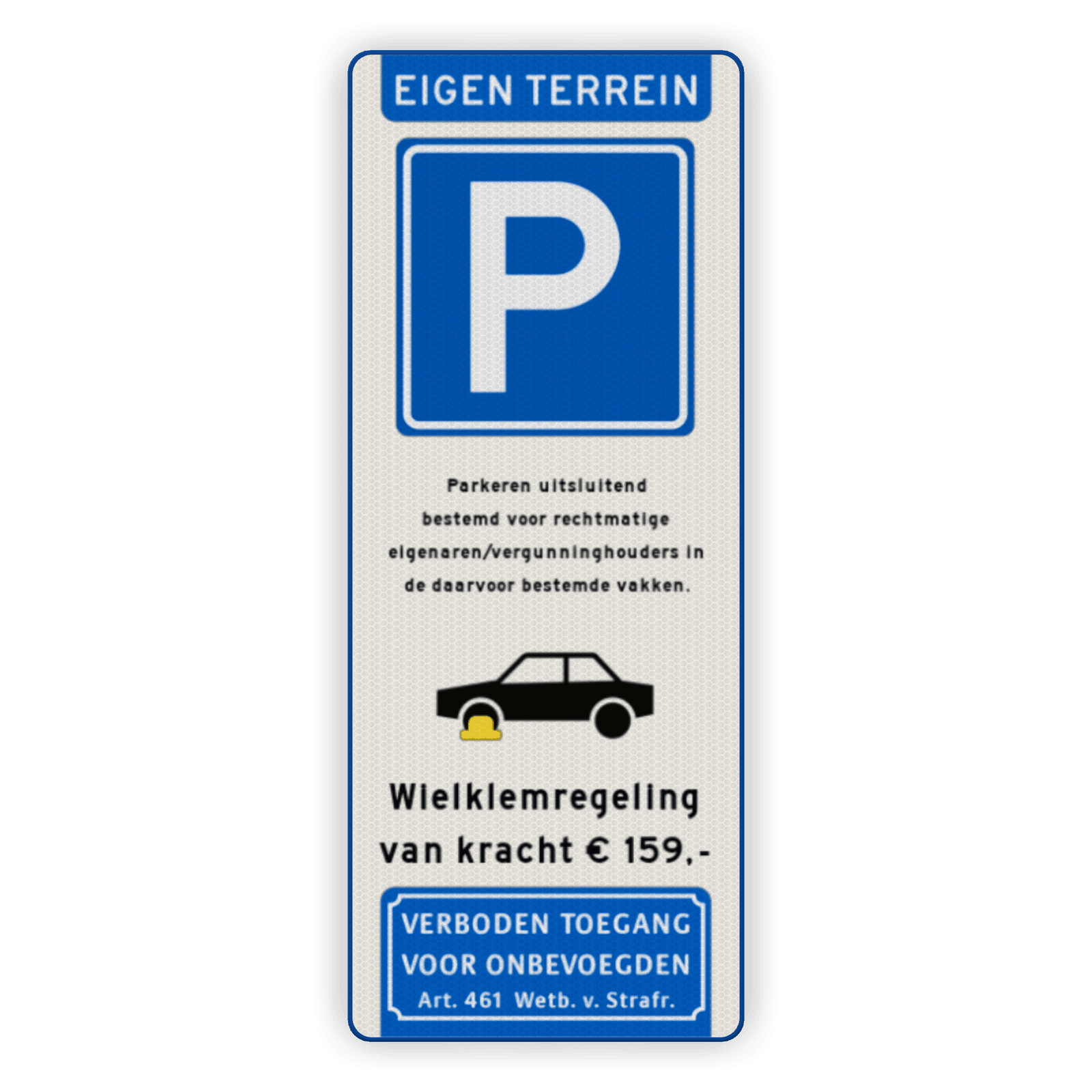 Parkeerbord eigen terrein voor vergunninghouders, tekstvlak en wielklemregeling